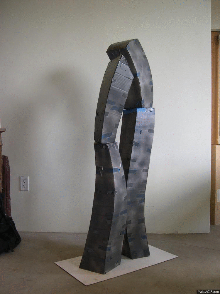 First, Frank marked up an image of the original sculpture (left). ‘Complement’ was larger than his clients wanted, so he adjusted the scale and used the new measurements to resize some cardboard cutouts from the original project (center). The new, smaller cardboard pieces came together to create a full-scale model of the new piece (right).