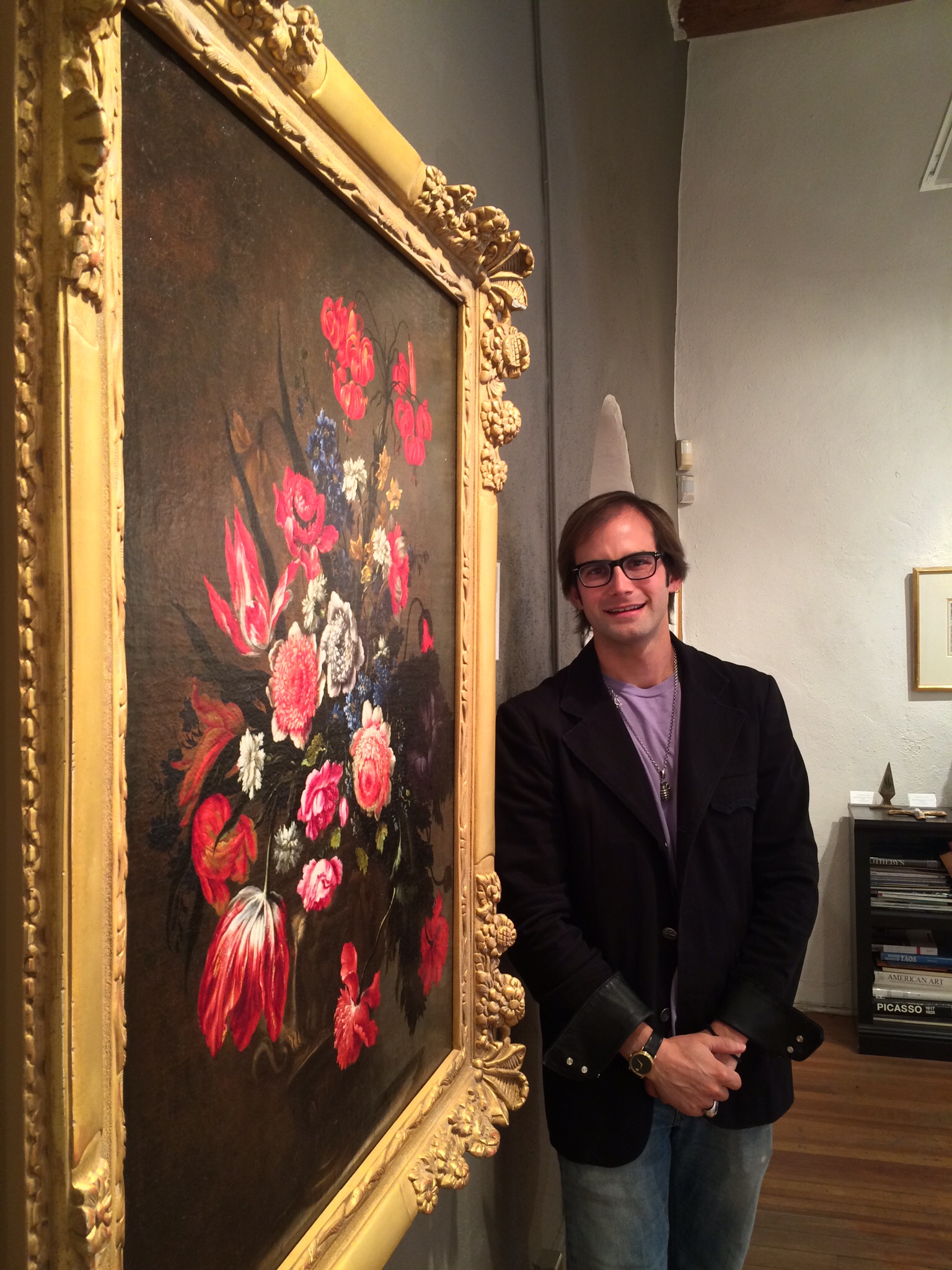 Conservator Matt Horowitz with a 17th century painting he restored for Matthews Gallery